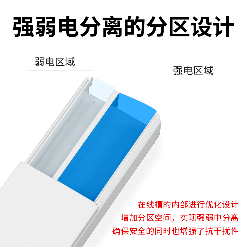 線槽采用雙層設(shè)計(jì),外鋁合金內(nèi)塑料,實(shí)現(xiàn)絕緣阻燃功能,中間隔板可實(shí)現(xiàn)強(qiáng)弱電分離。